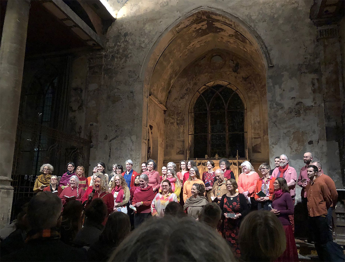 We immerse audiences in ‘song baths’ suggesting that they close their eyes and feel the music in their bodies. This kind of performance is about making an immersive, resonant soundscape. Rather like bathing in pure human sound with loving, present, un-amplified voices. I always include a trio at some point in each set, so that the audience gets a surprise when the sound shrinks and expands again.